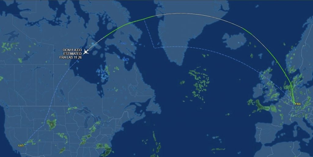 Die Sternenfahrt zum Airport war schon gut aufgeladen. Ich glaub jeder von uns war auf seine Art aufgeregt und super hyped auf Amerika, denn Amerika ist wunderbar 😀 der Check in ging eigentlich flott hatte aber so seine Momente insbesondere beim Check auf Sprengstoffe an mir. Ich fragte noch die Dame vorne: „Soll ich den Gürtel auch ablegen?“ sie verneinte, also ging ich durch den Scanner und Überraschung der Gürtel wurde detected. Daraufhin kam ein Typ zu mir, brummte mich an : „Gürtel aufmachen!“ – okay, auf damit… dann stand ich da und er brummte wieder: „das wird jetzt unangenehm ich muss den Schritt auch prüfen!“ – ich schon völlig übermüdet : was musst du tun? – Pam da wars schon zu spät und er grabschte einmal beherzt in den Schritt… gut, Safety First und so. Das versteh ich, aber 1) wenn ich vorne schon frage ob der Gürtel auch ab soll und das explizit verneint wird dann hat der Kerl ja 2) den ganzen Tag ein Schritt-Grabscher Job, da ja jeder nen Gürtel trägt der im Scanner immer erfasst wird…was zur Hölle?!? Komische Erfahrung und vor allem seltsamer Job! Naja die nächste seltsame Erfahrung gabs dann irgendwie 11 Stunde im Flieger. Nicht nur dass es 90 Minuten nach Start (= 11 Uhr Ortszeit) bereits Mittag gab, was ich verpennt habe und deshalb den gesamten Flug hungern durfte, nein zu allem Überfluss sitzt neben mir ein Inder der keine Berührungsängste verspürt. Mister Panjabi MC schaut nicht nur 11 Stunden Bollywood Filme auf seinem iPad, nein er lehnt auch entspannt die ganze Zeit über der Sitzlehne in meinem Tanzbereich. Das wiederum bedeutet das El Stevo weil ja introvertiert das Maul nicht aufbekommt und entsprechend die meiste Zeit halb im Gang hängt um meinen Tanzbereich zu verlagern. Gott war das nervig -.- zum Glück hab ich festgestellt, dass es im Flieger WLAN gibt und man damit kostenlos zumindest WhatsApp nutzen kann. So wurde mit der Kommunikation um den halben Erdball der sonst echt langatmige Flug etwas versüßt und kurzweilig. Was mir aber neben der Kommunikationsache wieder auffiel ist der ungewöhnliche Flugkurs auf der Landkarte. Durch die Erdkrümmung sieht der auf der Karte eher wie ein Umweg aus, aber nee der kürzeste Weg Frankfurt – Vegas geht über England – Grönland – Kanada. Klingt komisch, is aber so…