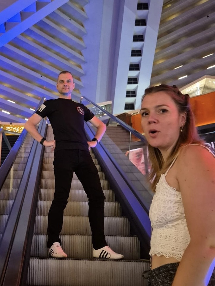 Wir belassen es lieber beim umschauen, schauen wir mal und da mal, aber ehrlich just looki looki ohne touchi touchi, ist eher mau als schau. Gut dass wir noch 3 Hallen vor uns haben. Also navigiert Ramoni nach 30 Minuten Darkness, Neon und gefrier Temperaturen zum Ausgang. Sie öffnet die Tür und meine Netzhaut will verdampfen – fuck war das hell! Das schlimme sobald man rauskommt steht man wieder in der prallen Sonne bei gefühlten 100 Grad im Schatten… wir flüchten uns fix in die nächste Halle. Leider ist hier nur ein Game – Zombies abschiessen mittels Argumented Reality in einer dafür inszenierten Umgebung. Postapokalyptisch… genau wie unser Frustlevel. Kostet natürlich – keine Ahnung wieviel – aber wir drehen um und gehen raus. 150 Grad auf der Haut, Wind kommt auf 160 Grad heißen Fön mitten in die Fresse… Jap, sind wir genervt! Wir laufen zur Halle 3 – The Same aber im John Wick Setting. Wir gehen nicht mal rein in die Halle man sieht ähnlich wie bei den Zombies ja eh nix. Halle vier schenken wir uns sogar den Weg weil 200 Grad im Schatten… Fazit: Area15 schon geil, wenn die Münzen wie ein Wasserfall in den Vegas Gierschlund fallen. Ohne Wasserfall oder Münzen eher so la la. Aber naja immerhin hab ich ne Tasse für meine kleine Sammlung daheim gefunden…